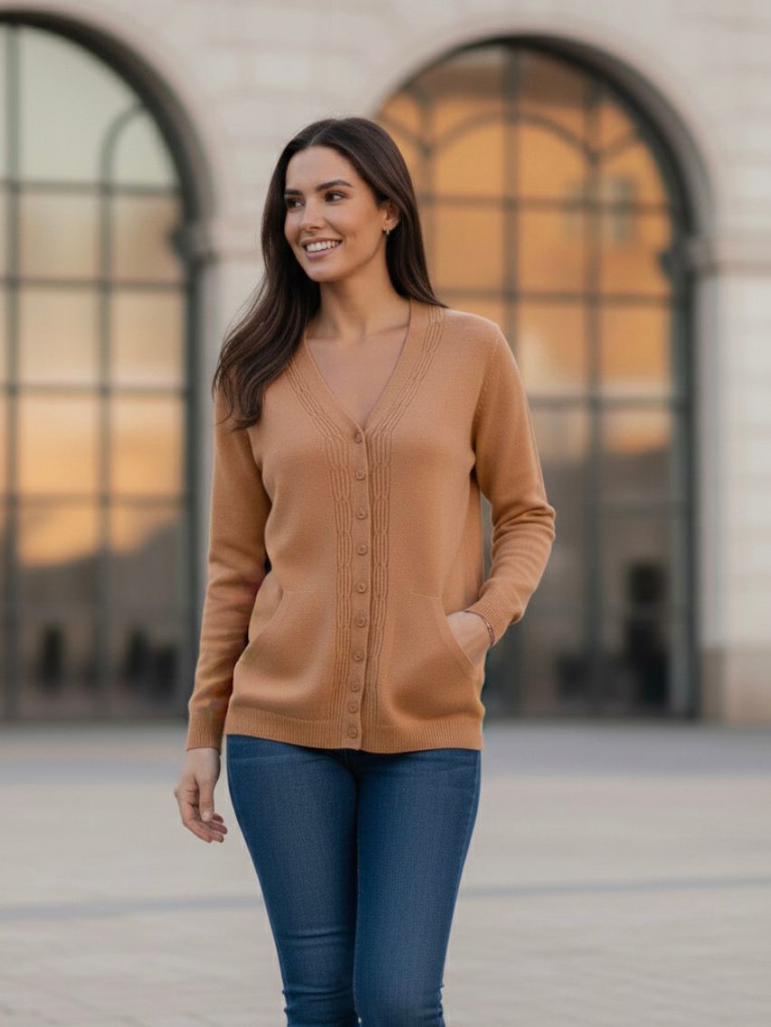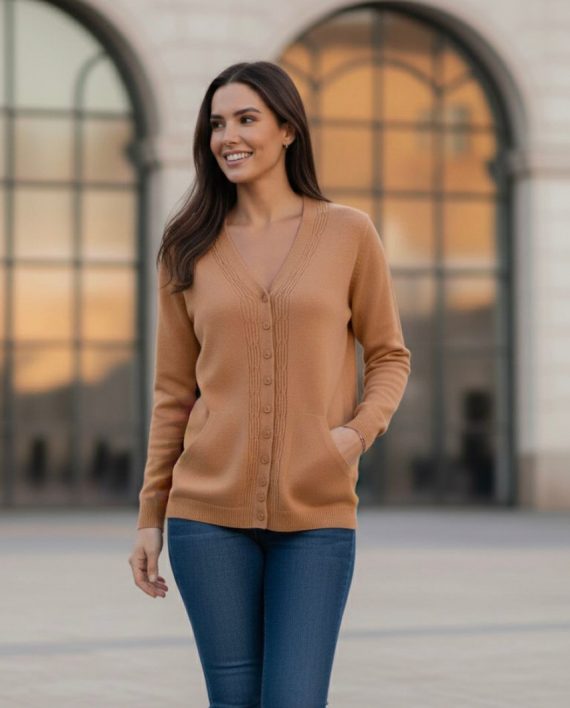 Artículo: 371Saquito con botones y bolsillos. Detalle de tejido en trenzas