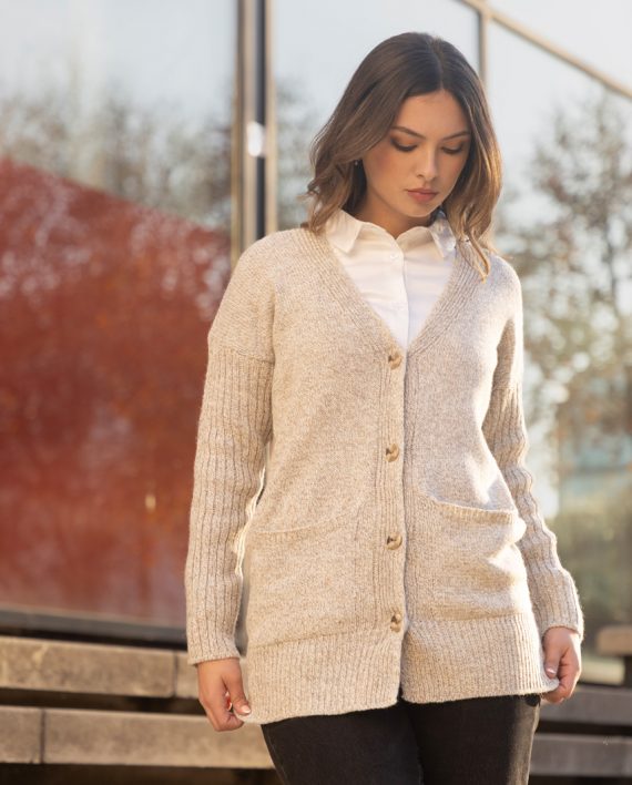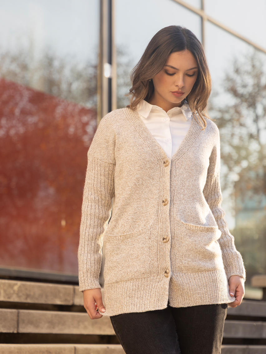 Artículo: 457Cárdigan con bolsillos en delantera y punto canelon en manga.