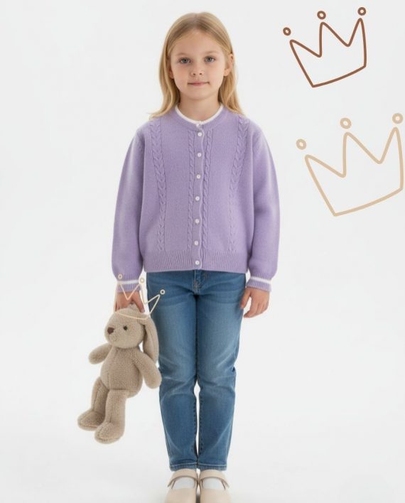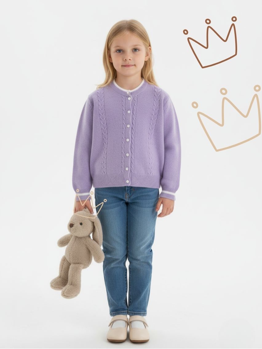 Artículo: 385Cárdigan con vivo en cuello y puños combinados. Delantera con trenzas y ochos.