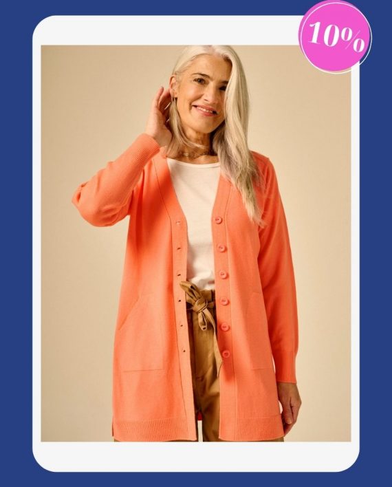 Saquito largo, con bolsillos. Detalle de tajos en los laterales.