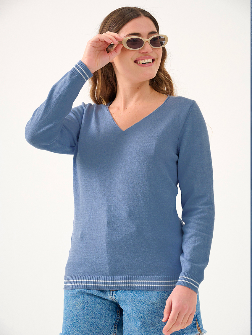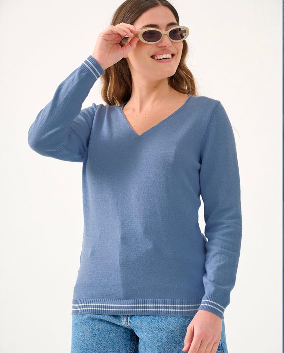 Artículo: 636Sweater escote en “V” con terminaciones rayadas en puños y elástico.