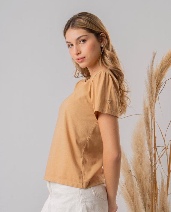 Artículo: 576Remera manga corta fruncida y bordado de mariposa con brillos en manga izquierda.