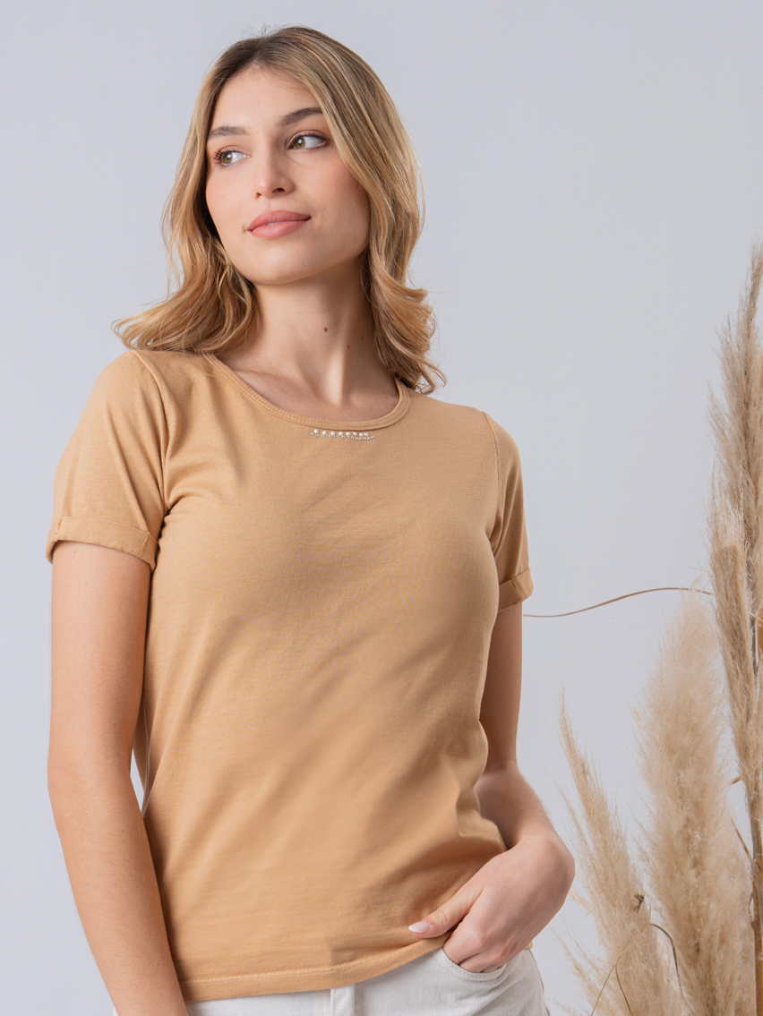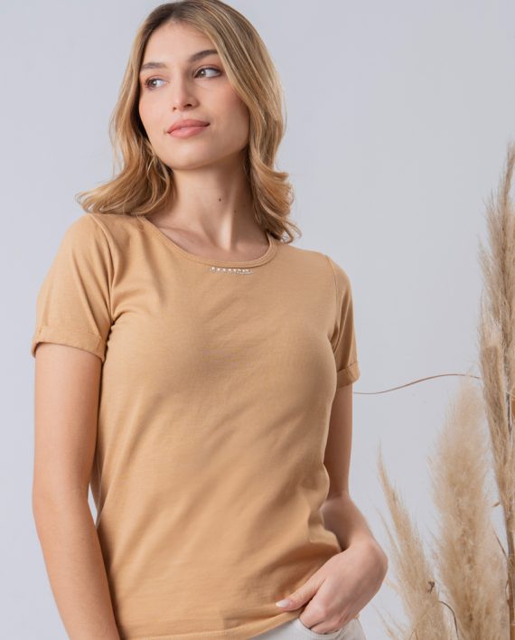 Artículo: 573Remera clásica con manga doblada y avíos en escote.