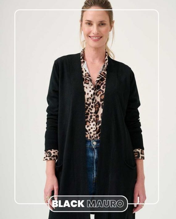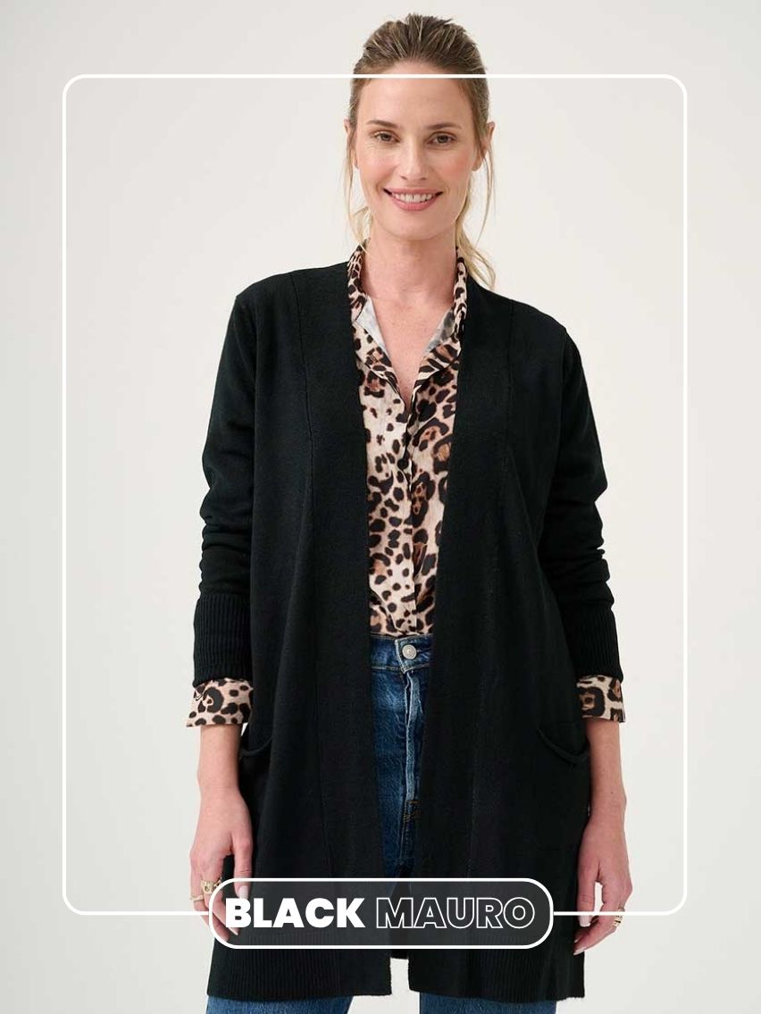 Saco largo abierto con bolsillos y tajos laterales. Detalle de puño doblado.