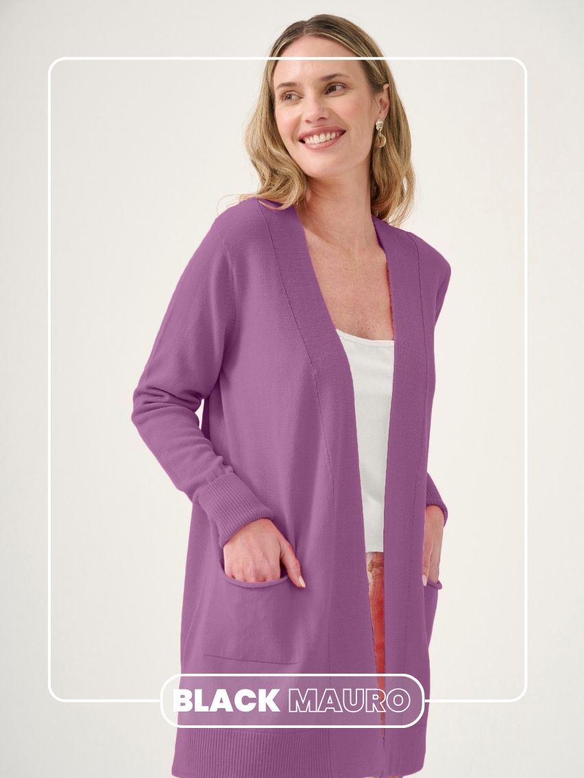 Saco largo abierto con bolsillos y tajos laterales. Detalle de puño doblado.