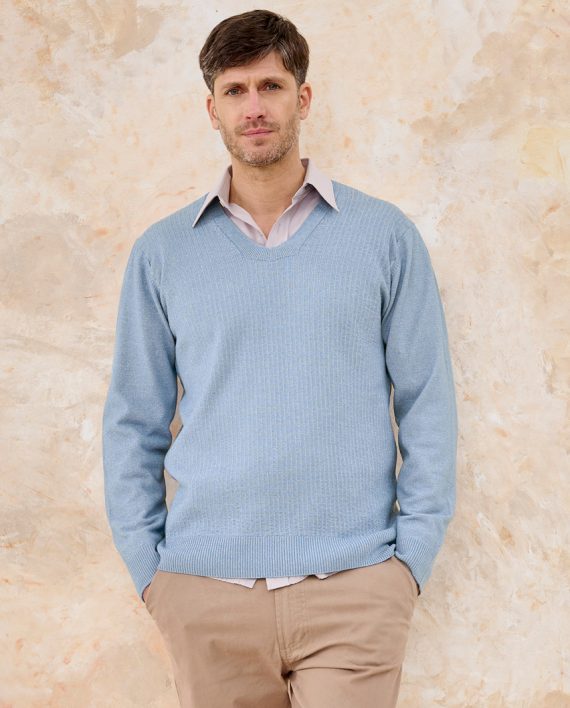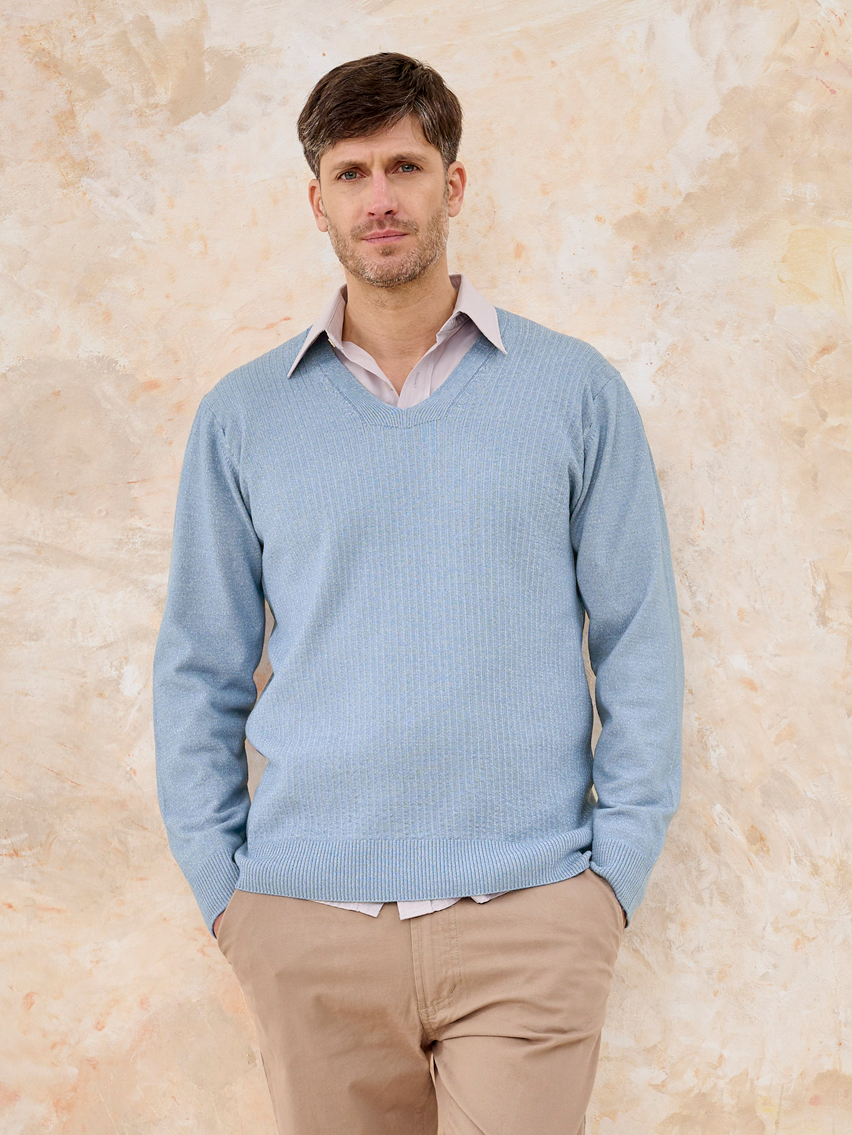 Artículo: 393Sweater escote en “V” con textura rayada delantera.
