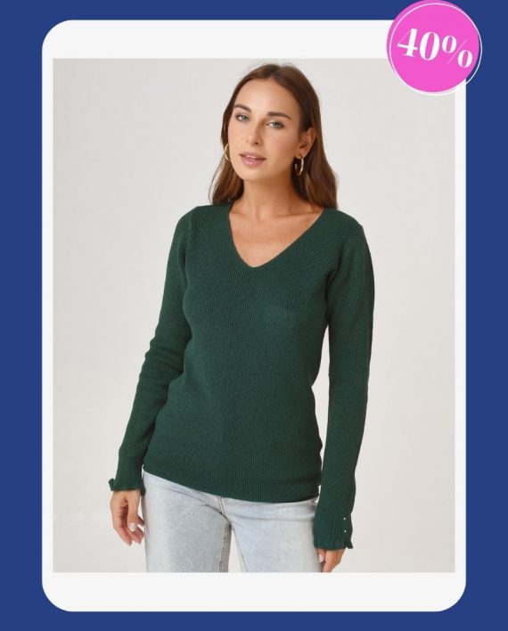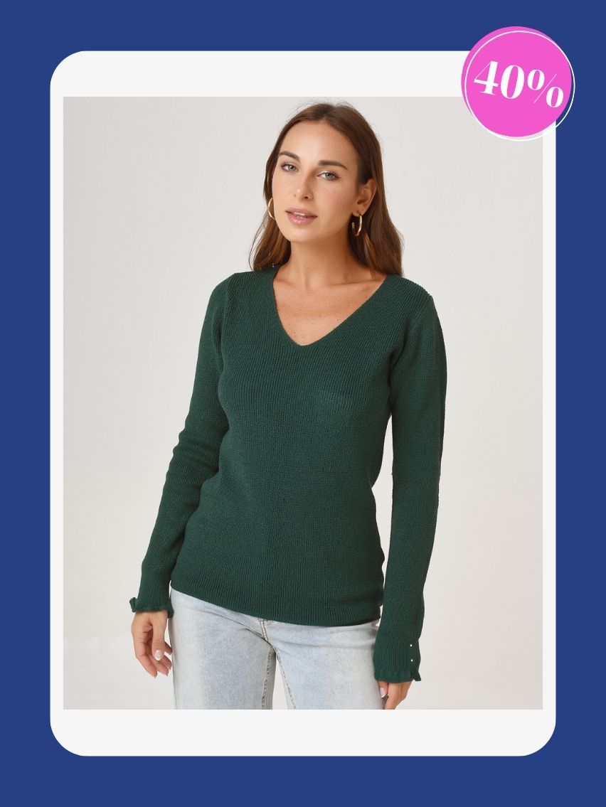 Sweater escote en “v”, con medias perlas en puños.