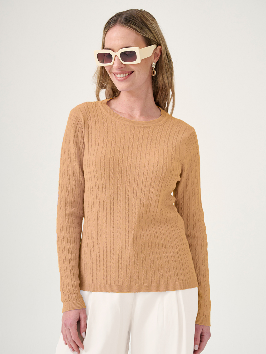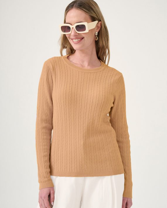 Sweater cuello redondo, tejido con trenzas y canelones.