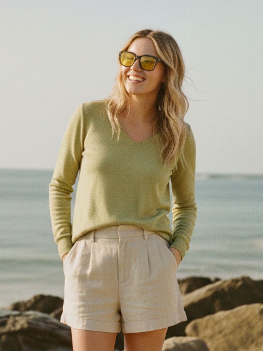 Artículo: 345Sweater escote en “v”, con tajos en los laterales. Diferencia de largo entre delantera y espalda.