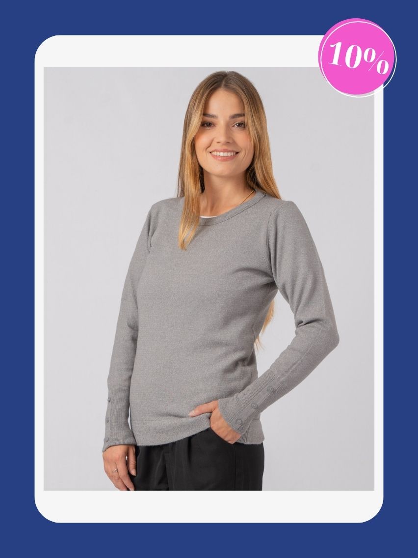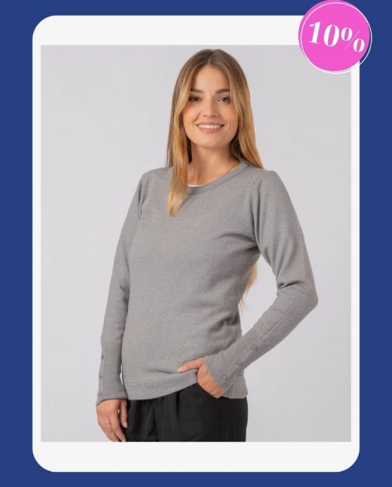 Sweater cuello redondo, puños altos. Detalle de botones en manga.